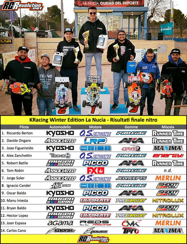 Al termine delle qualifiche il pilota italiano Davide Ongaro si aggiudica la TQ sia nella classe Nitro che in quella Brushless. Nella finale Nitro da quarantacinque minuti il pilota italiano Riccardo Berton sorprende tutti andando a vincere partendo dalla posizione numero quattordici in griglia di partenza, mentre nella categoria Brushless Davide Ongaro vince le prime due finali aggiudicandosi quindi la vittoria generale. Ottimo risultato anche per l’altro italiano in gara Alex Zanchettin, terzo classificato nella classe Nitro e quarto nella Brushless.