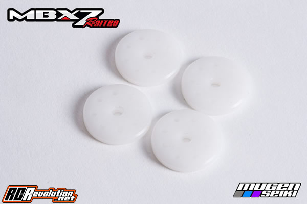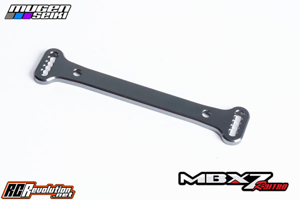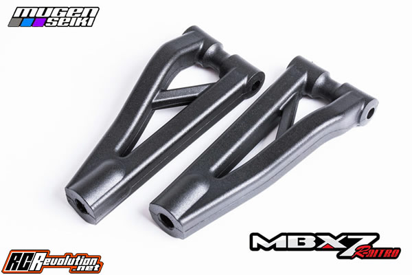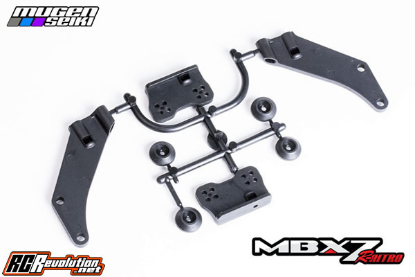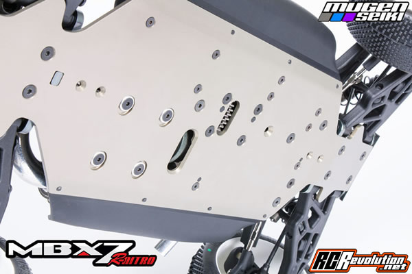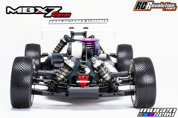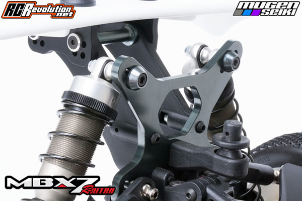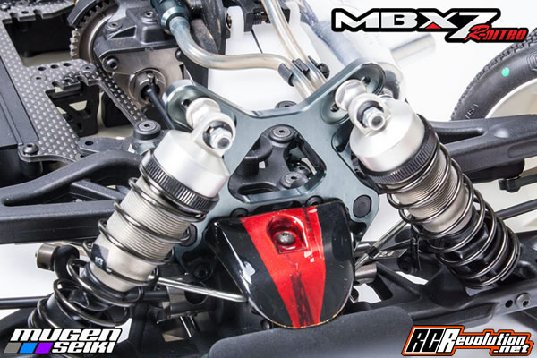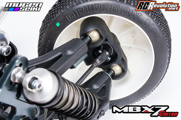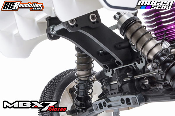 Mugen si è concentrata sul miglioramento delle sospensioni sul buggy MBX7R adottando un nuovo corpo ammortizzatori da 16 millimetri sia per l’anteriore che per il posteriore. I nuovi ammortizzatori miglioreranno la stabilità sia sulle buche che sui salti. I corpi ammortizzatori di diametro maggiore renderanno il comportamento delle sospensioni più costante nel tempo per una migliore guidabilità nelle fasi di gara più lunghe. Gli ammortizzatori posteriori quattro millimetri più corti e il nuovo supporto ammortizzatori posteriore aumenteranno la tenuta del posteriore del buggy MBX7R. Il telaio ha le estremità laterali inclinate con un diverso angolo per una maggiore rigidità che migliorerà il comportamento su tutte le superfici.