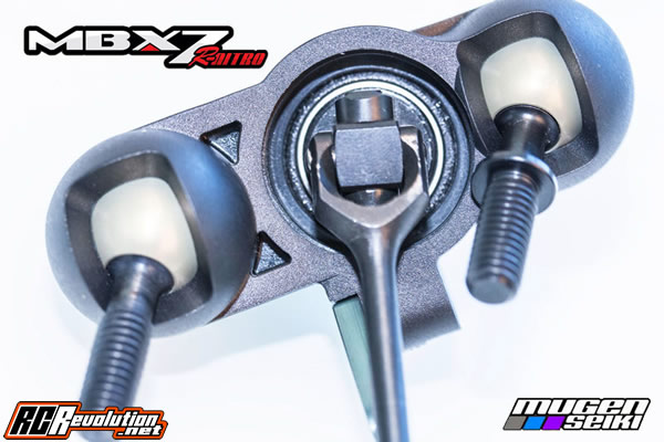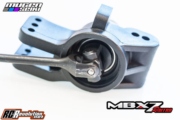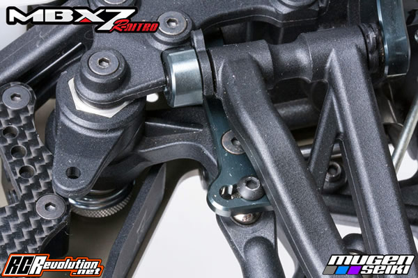 Il buggy MBX7R monta un portamozzo anteriore ridisegnato in cui la posizione dell’asse anteriore può essere regolata. Ciò permetterà di migliorare la risposta dello sterzo. La nuova piastra di sterzo ackerman con l’aggiunta di fori permetterà maggiori regolazioni dello sterzo. Il braccio superiore anteriore della sospensione è stato accorciato di 1,6 millimetri per consentire una maggiore regolazione del camber e l’uso del distanziatore E0161 tra la sfera ed il braccio.