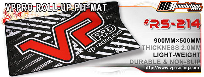 VP-Pro presenta Roll-up pit mat (art. RS-214). Realizzato in materiale leggero, resistente e antiscivolo di 2 mm di spessore, il tappetino misura 90×50 cm e sfoggia un grande logo VP-Pro nero, rosso e bianco. Il tappetino è resistente alla maggior parte dei prodotti chimici utilizzati nell’automodellismo e si arrotola per facilitarne il trasporto.